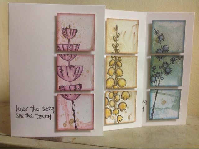 I cut three 5 cm x 15 cm panels and coloured them with as little Bister as possible (red, yellow and blue). I stamped the flowers with black ink, heat embossed with clear powder and added colour with Distress Markers and a waterbrush + some accents with a white gel pen. The backgrounds looked a bit dull, so I sprayed with pearl/glimmer sprays in the image colours and Colour Bloom Tea Stain. I stamped and heat embossed the sentiment on each card, cut each panel in three and mounted them on foam pads. Here's each card separately, their envelopes peaking from behind: